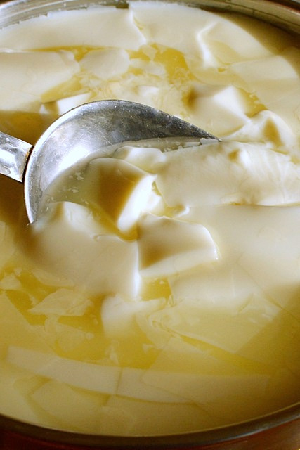 3. Nemaišydami puodo, sutvirtėjusį pieną suraikykite švariu peiliu į kvadratėlius. Dar kartą vos vos, vis dar nemaišydami, pašildykite. Netrukus per pjūvio vietas pasirodys geltonos skaidrios išrūgos. Nukaiskite.